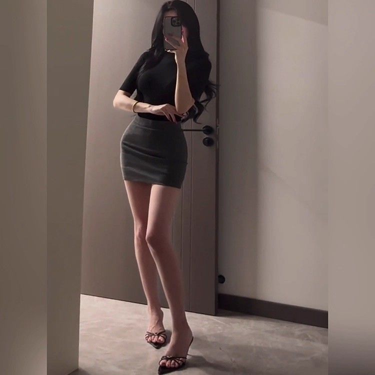 美式辣妹百搭夏季黑色新款纯色修身T恤半高领打底中袖上衣短款