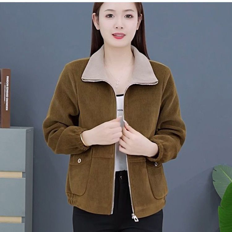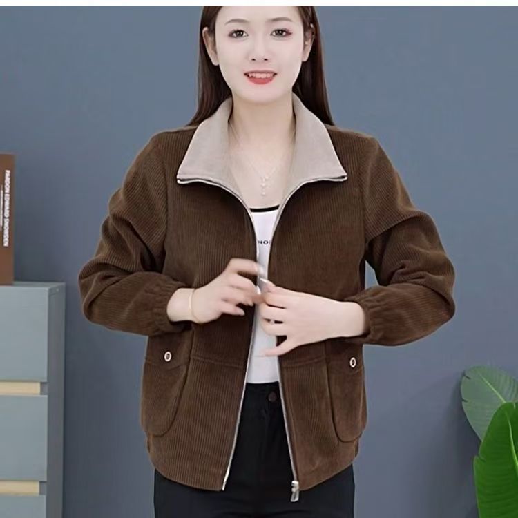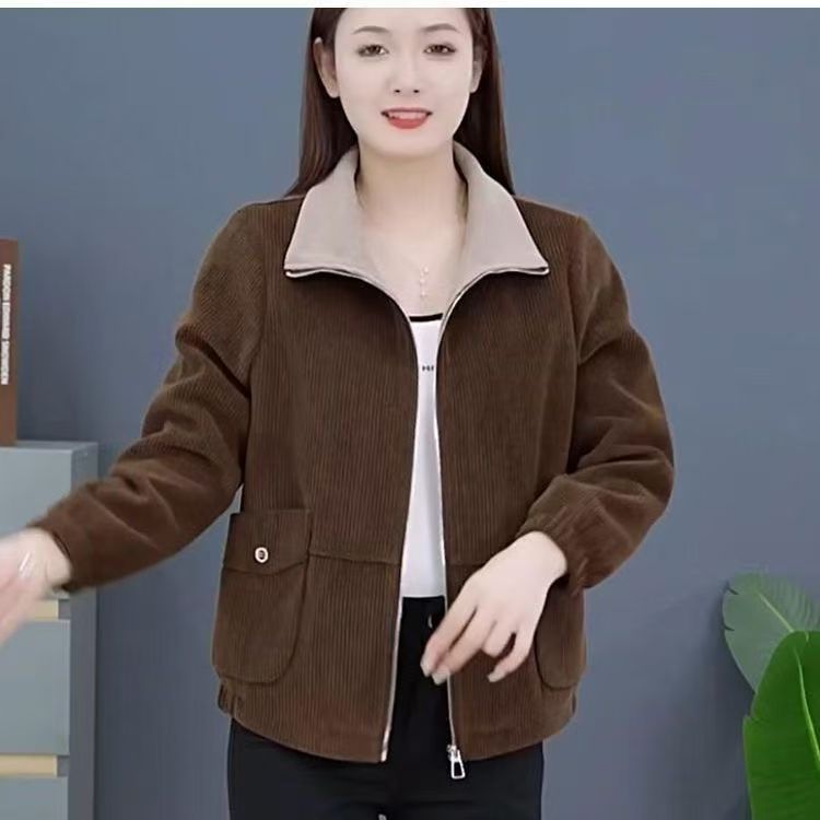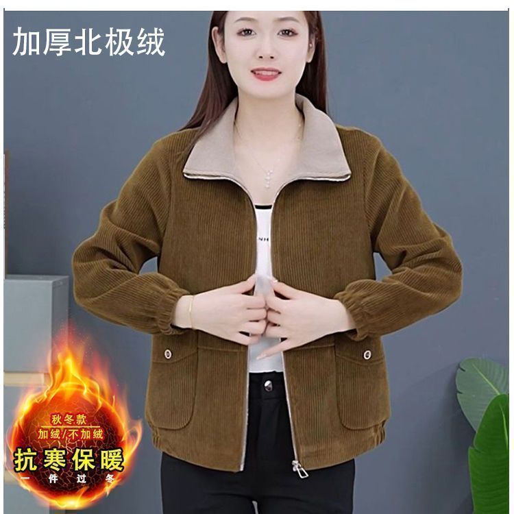 灯芯绒加绒加厚外套妈妈洋气上衣中年时尚翻领短款小个子新款休闲