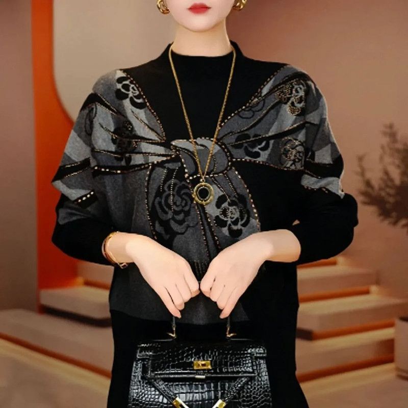 清仓时尚加绒保暖打底衫冬季新款复古花色大码宽松休闲减龄小衫