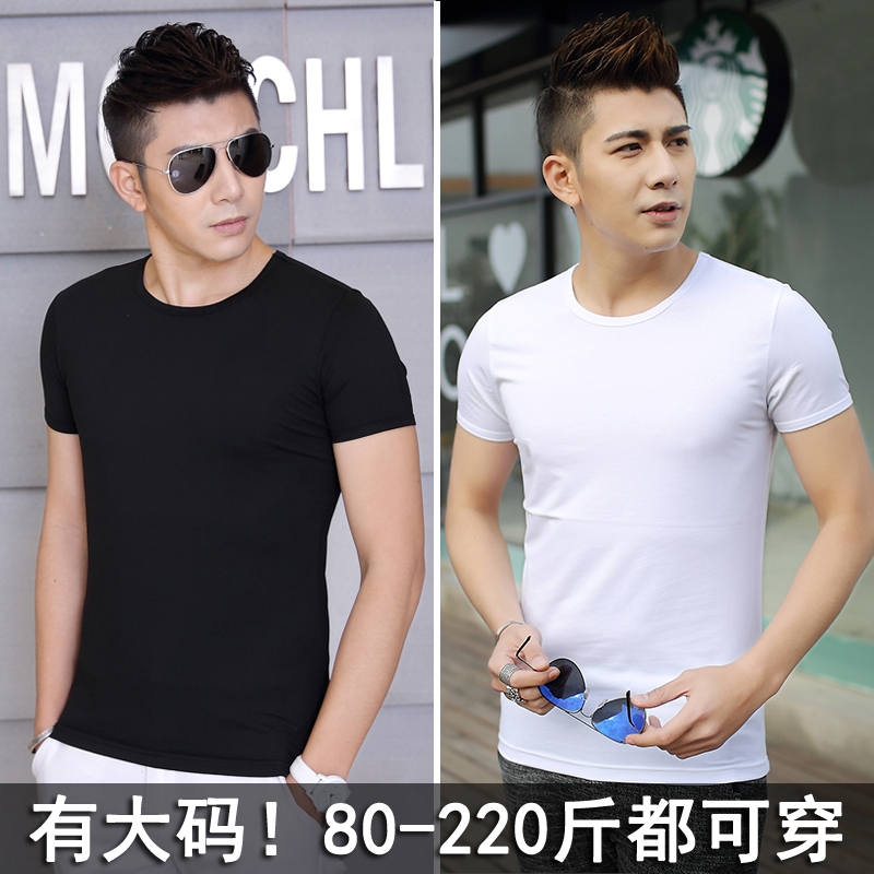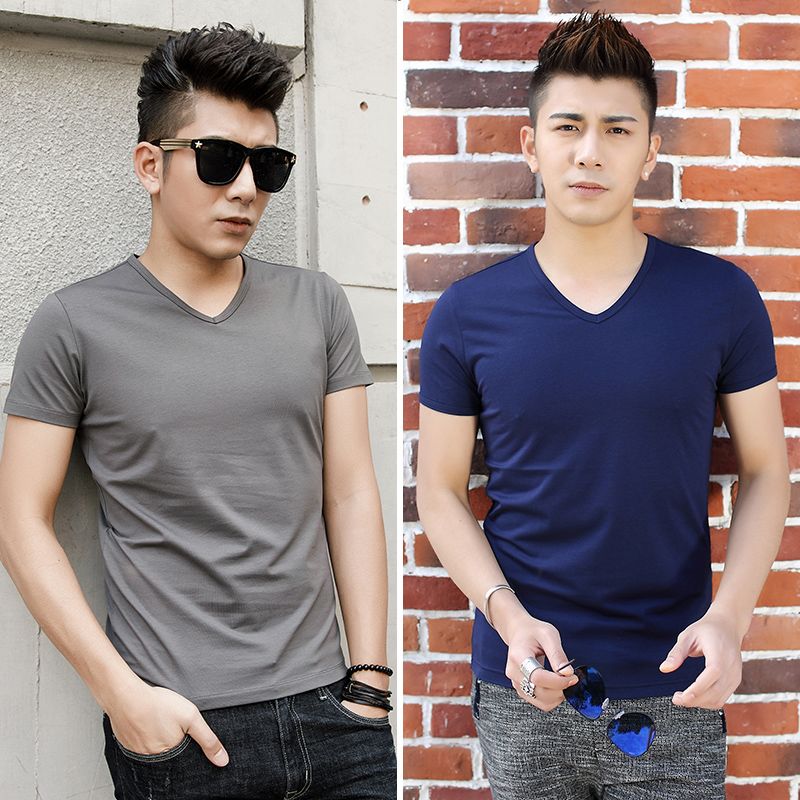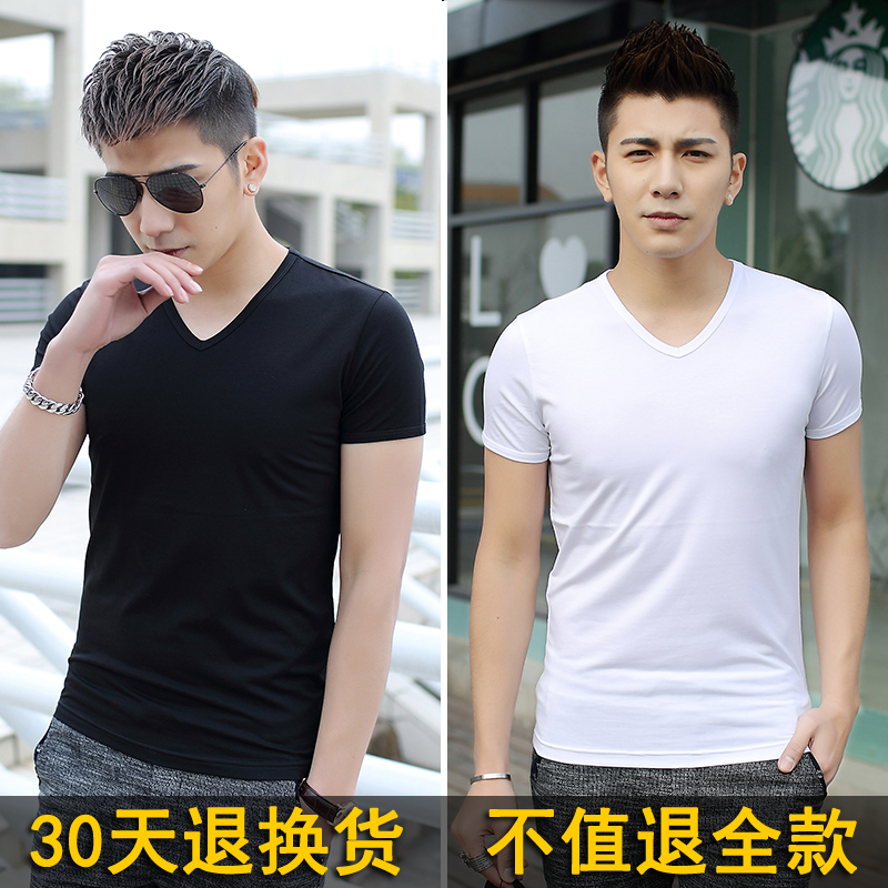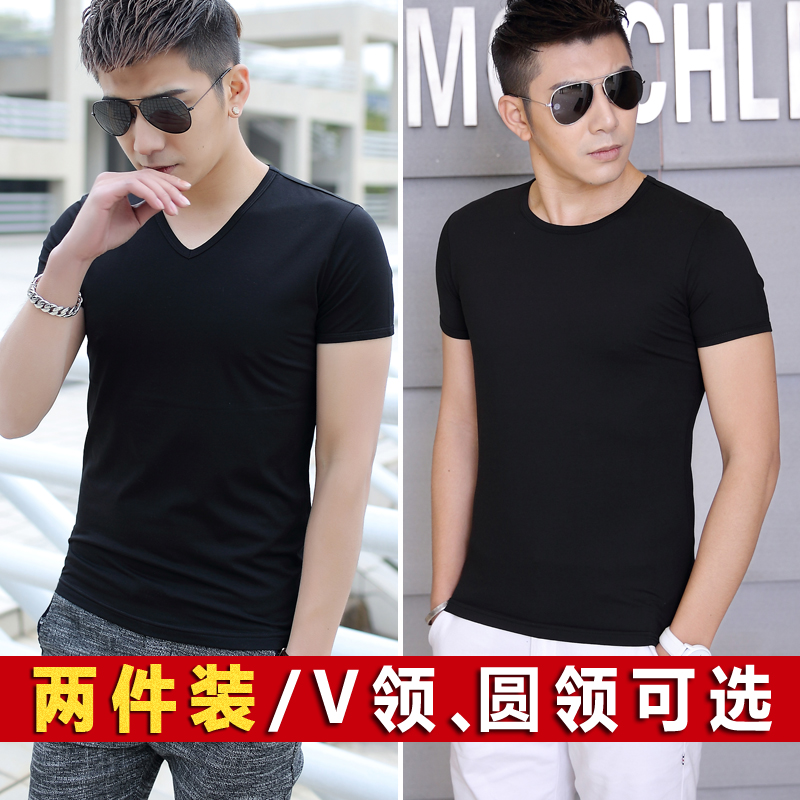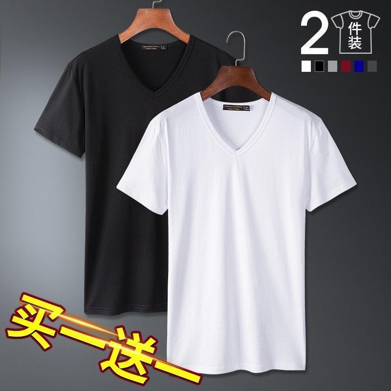 买一送一】短袖t恤男士夏打底衫v领纯色黑色修身潮运动体恤2/1件