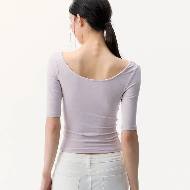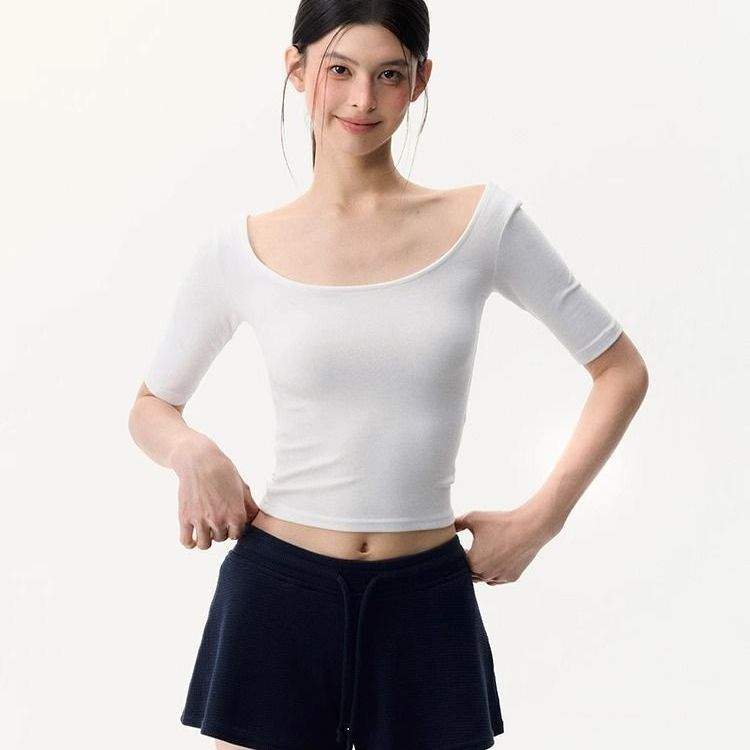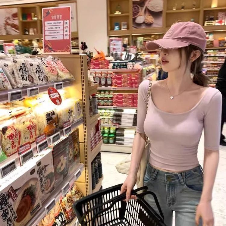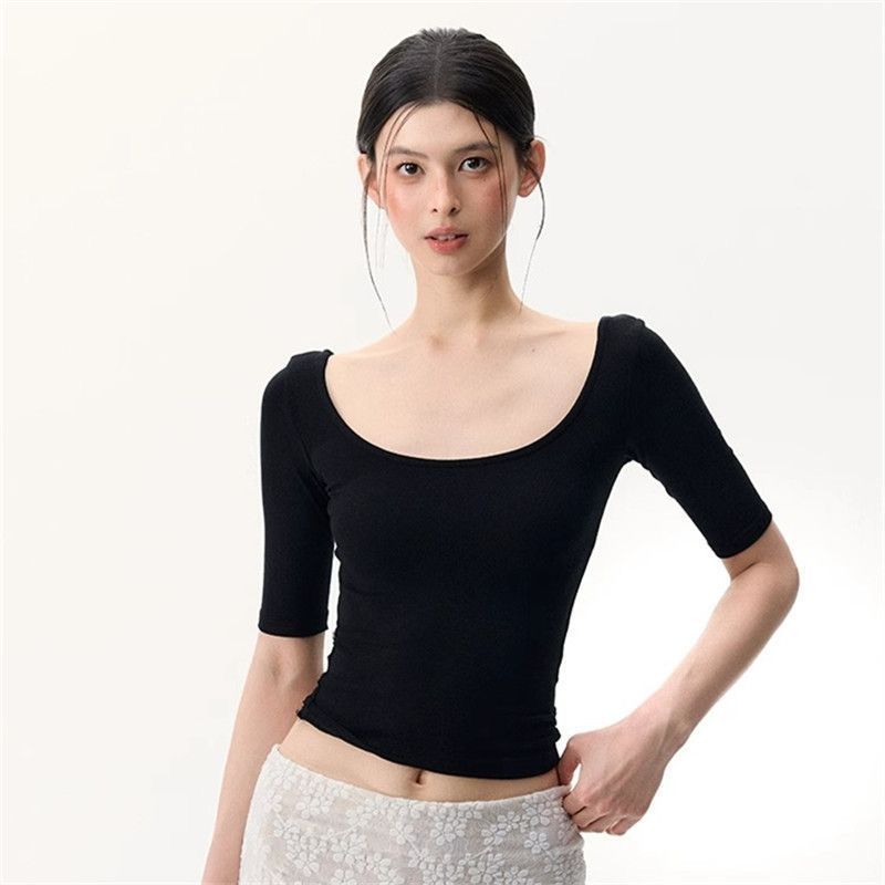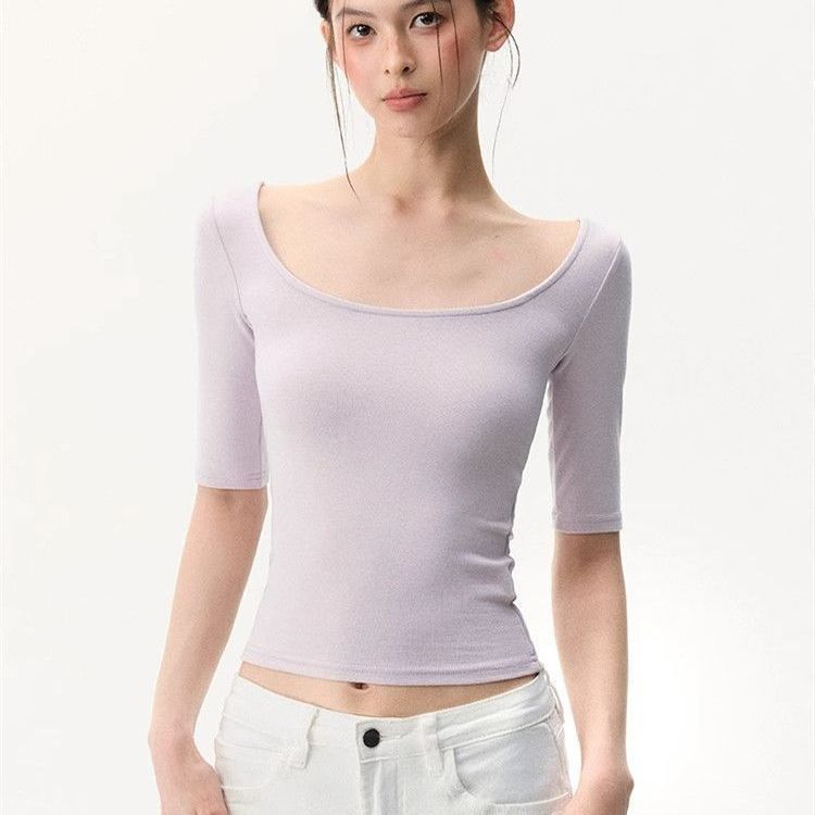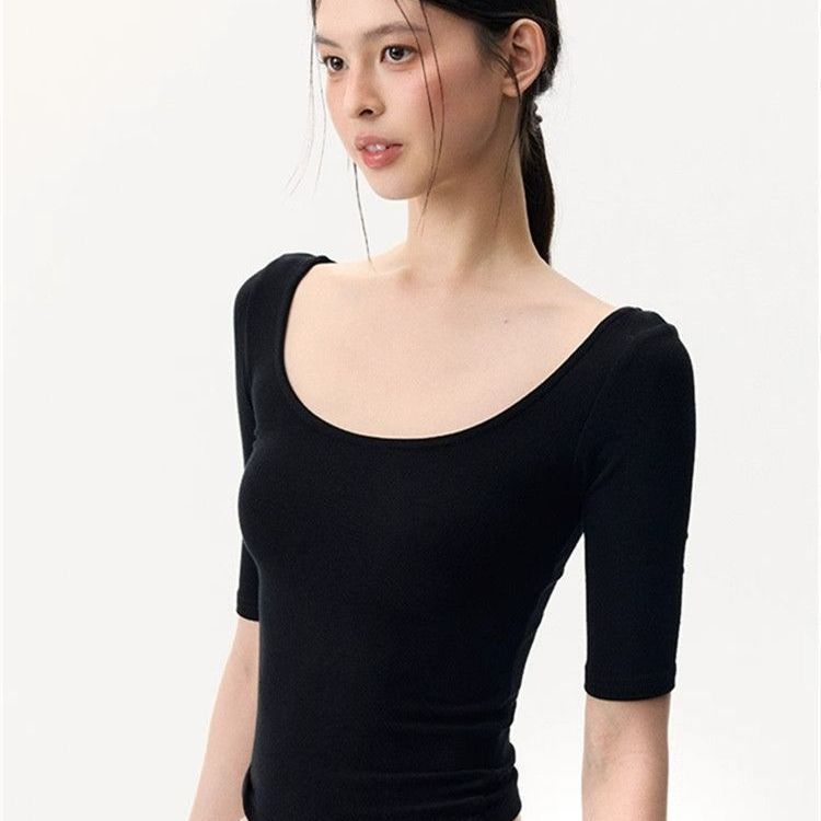 新款五分袖甜辣T恤U领纯色修身打底极简韩版外穿内搭百搭短袖夏季
