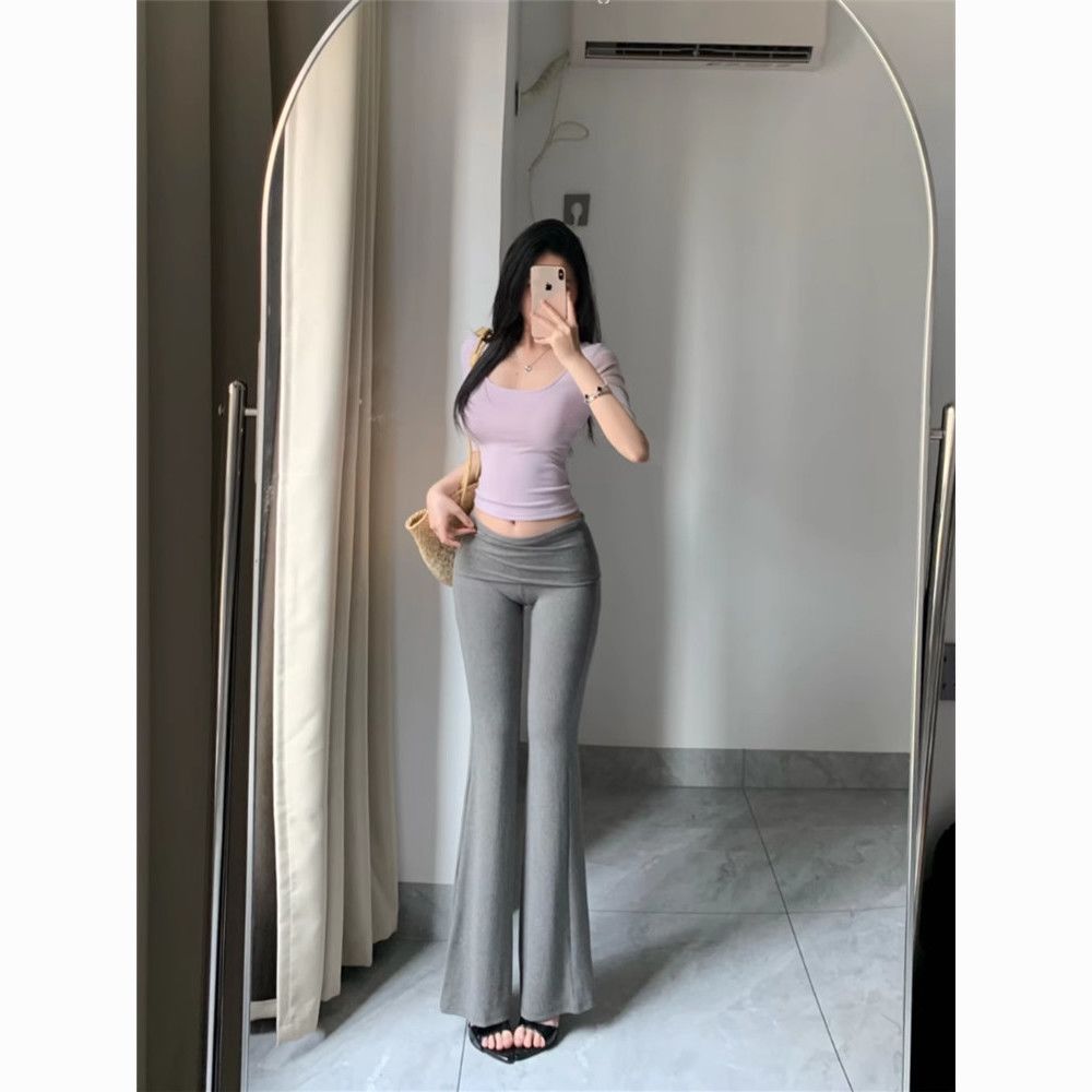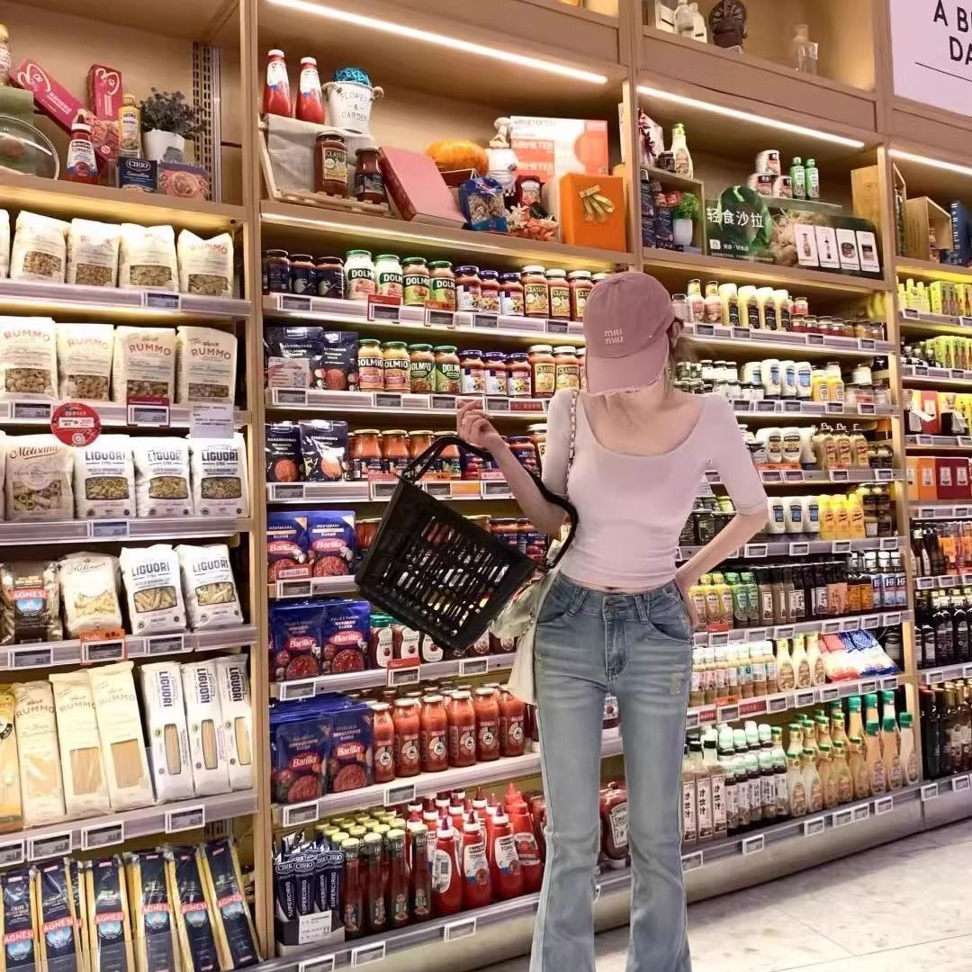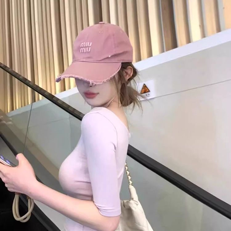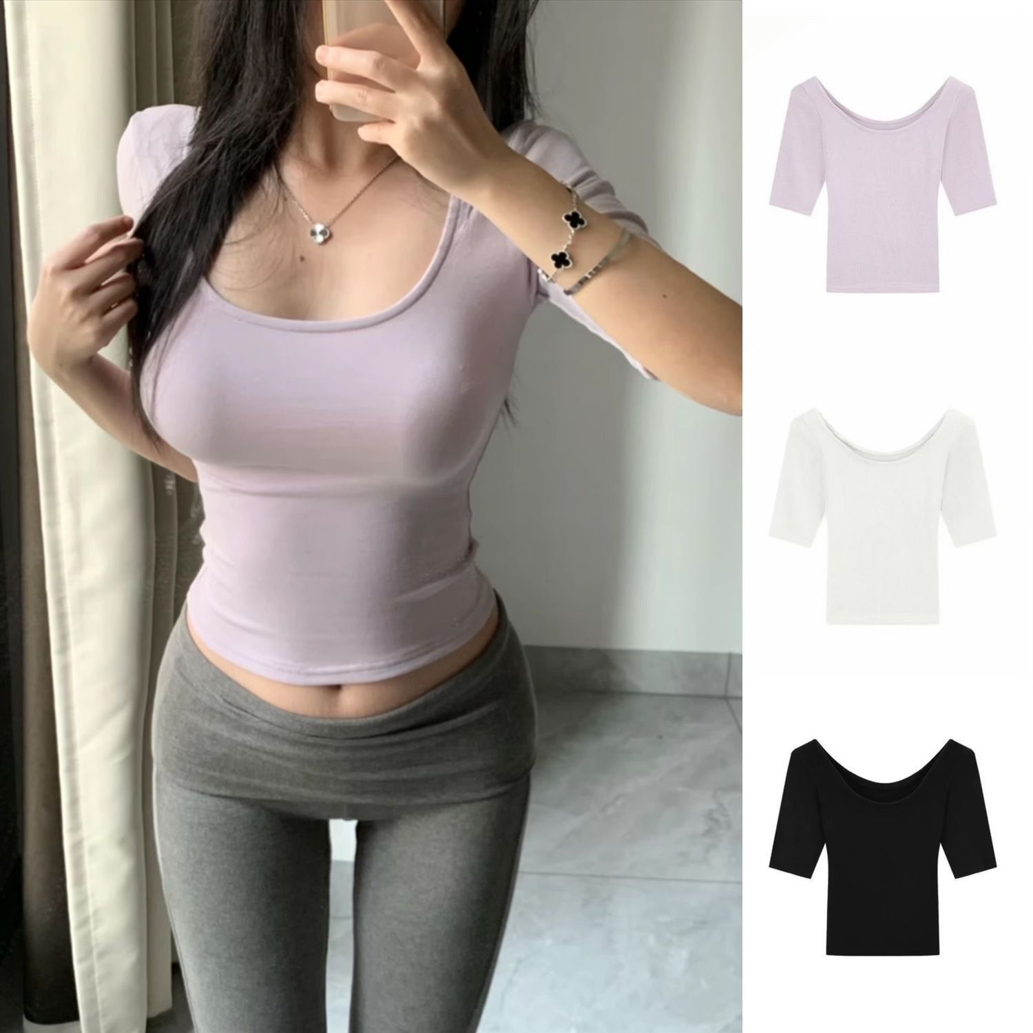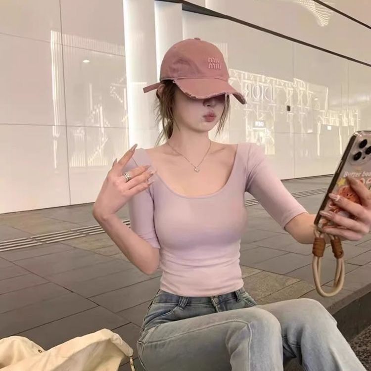 美式复古正肩黄色中袖t恤女夏季纯欲辣妹修身显瘦掐腰百搭上衣潮
