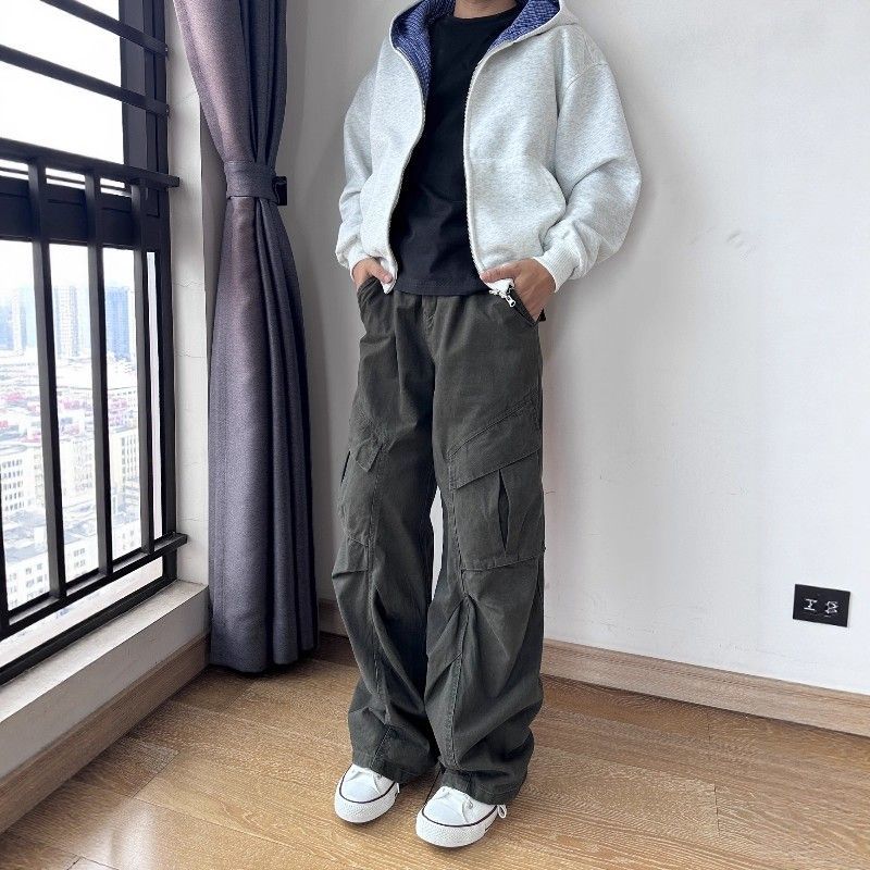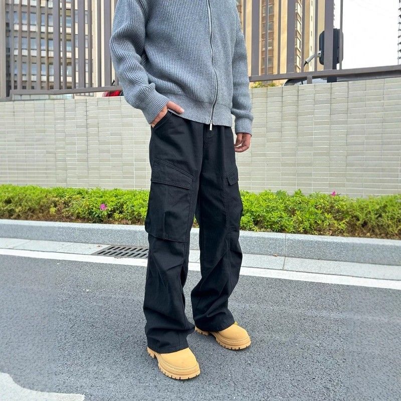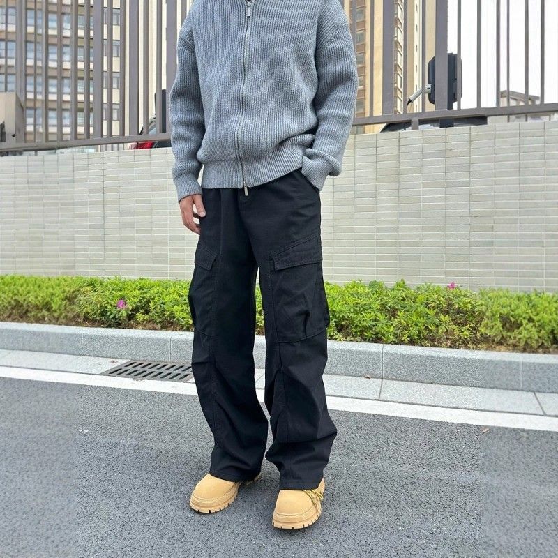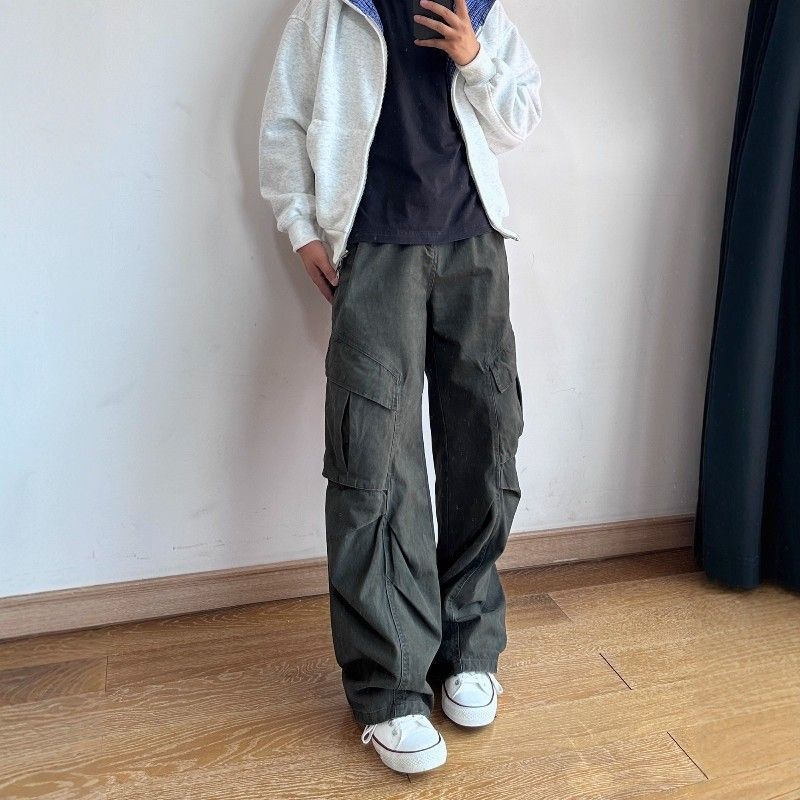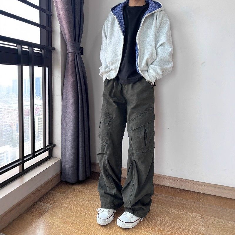 IRA美式复古牛仔工装裤男春秋新款大口袋宽松阔腿显瘦褶皱直筒裤